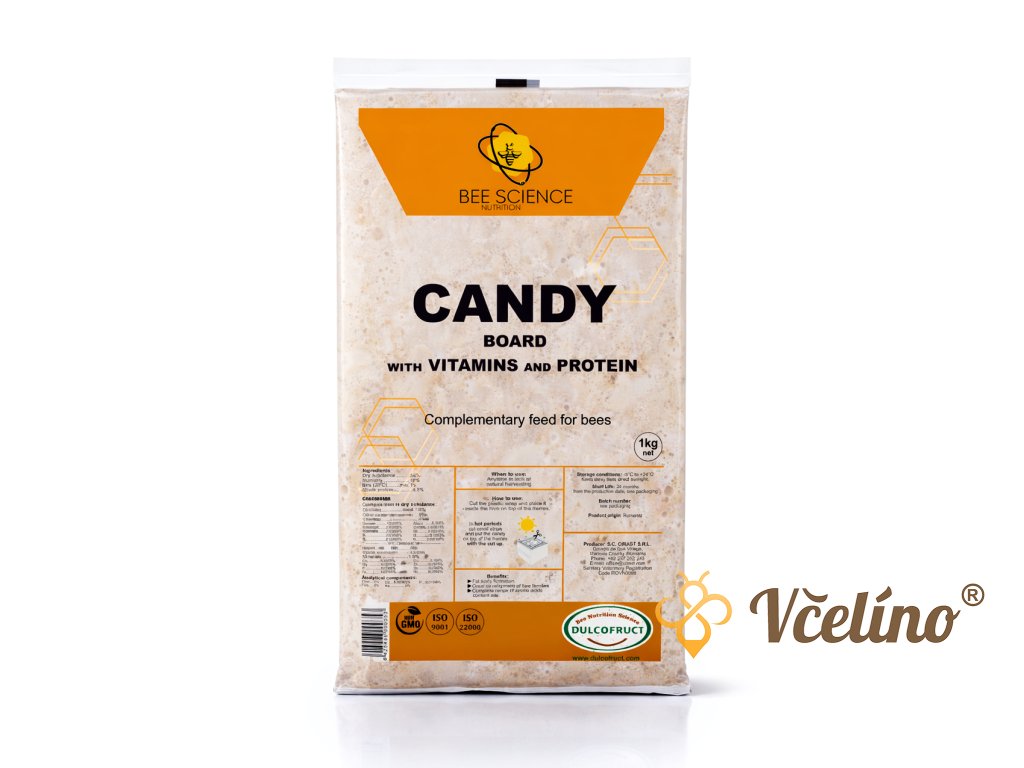 Candy Board - Těsto s vitamíny a proteiny je krmivo s recepturou obohacená o proteiny a esenciální aminokyseliny stimuluje tvorbu tukového tělíska a zajišťuje optimální vývoj včelích rodin. Doporučeno k použití na jaře, v létě a na podzim v obdobích, kdy je pyl nedostatečný a/nebo nekvalitní.