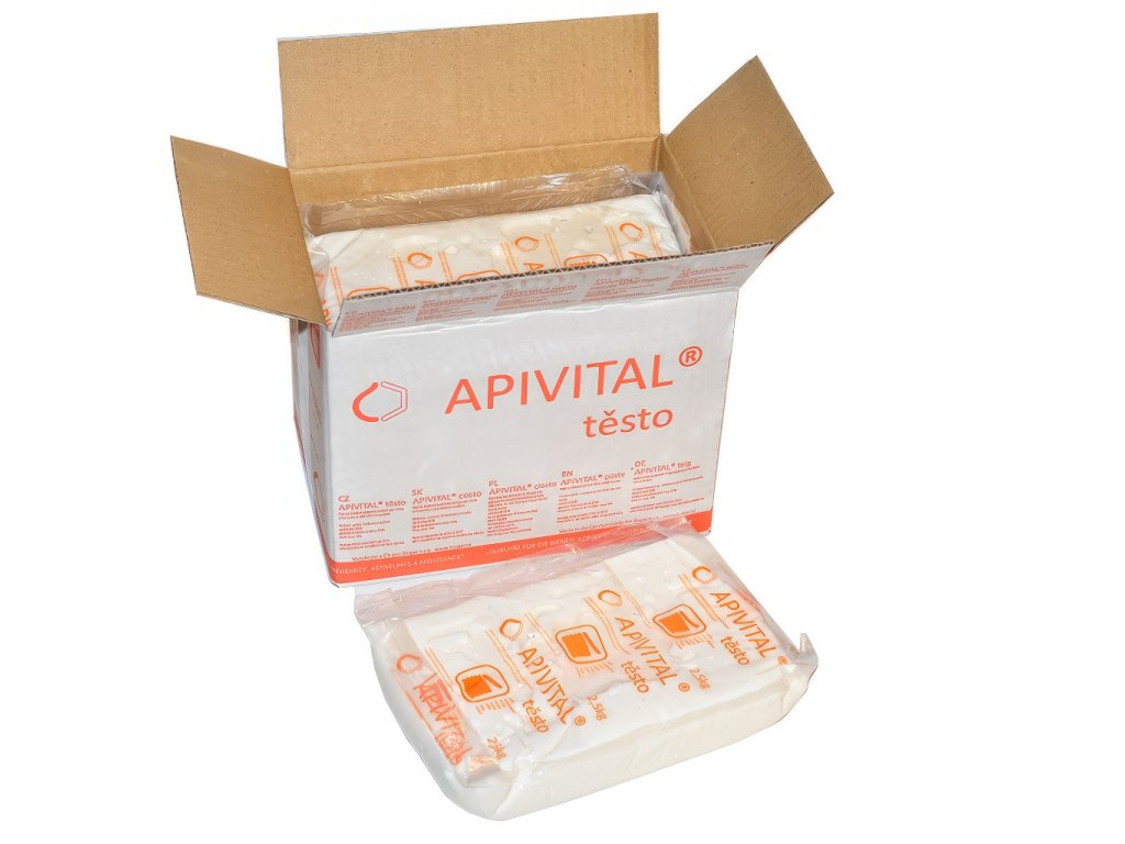 Díky pevné konzistenci se s těstem dobře pracuje – naporcujete, vložíte na rámky a je hotovo. Netekoucí hmota zajišťuje čistotu v úlu i při vyšších teplotách. Apivital lze využít i pro zimní krmení na jednu návštěvu – ideální tam, kde není možné včely kontrolovat častěji.