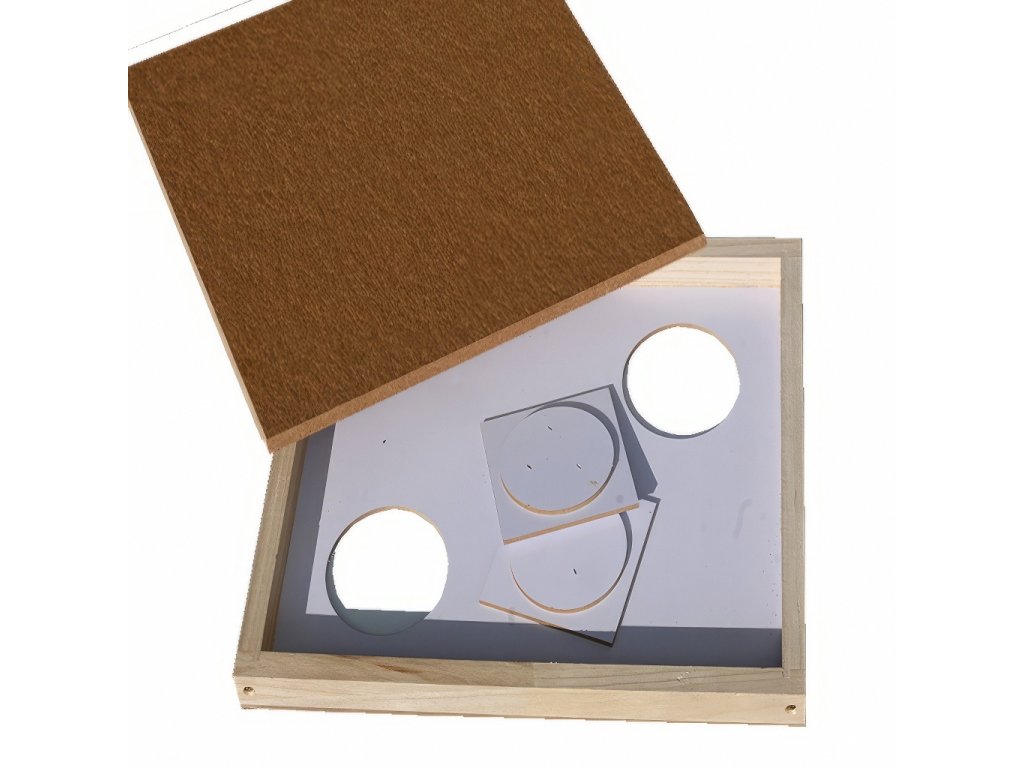 Toto víko není jen krycí prvek – díky dvojici otvorů a možnosti doplnění výlezů ho snadno proměníte na výkluz při medobraní. Skvěle poslouží i jako vnitřní víko s tepelnou izolací či krmná deska. Minimalizuje rušení včel při manipulaci a vylepšuje klima v úlu.