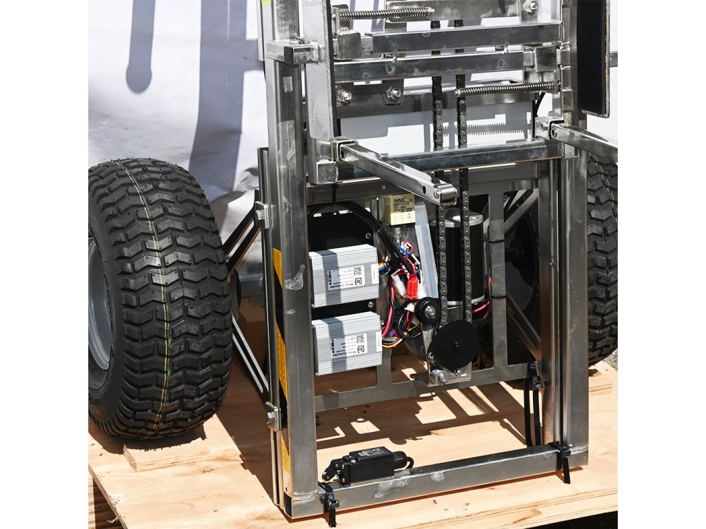 Výkonný elektrický úlový vozík z nerezové oceli pro snadnou manipulaci s úly, nástavky i těžkými nádobami – ideální pomocník pro moderní včelaře.