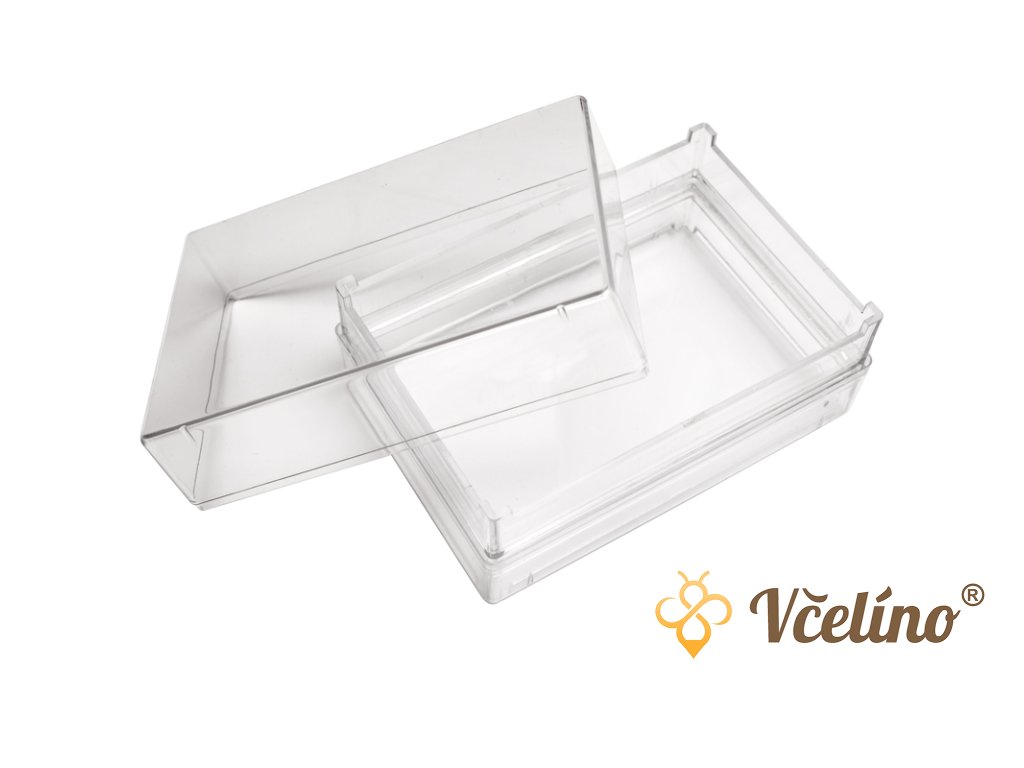 Miska na plástěčkový med plexi, 500g, 137x94mm je plastový obal určený pro skladování, přímou konzumaci a prodej medu ve formě panenského plástu. Umožňuje hygienické a estetické zabalení plástěčkového medu, který je ceněný pro svou čistotu, originalitu a přírodní formu. Tato miska se skládá ze tří částí – základního rámečku a dvou průhledných víček, které slouží jako spodní i horní kryt. Rámeček je tvořen dvěma díly, aby se mezi ně dala vložit mezistěna nebo vyříznutý vystavený panenský plást.