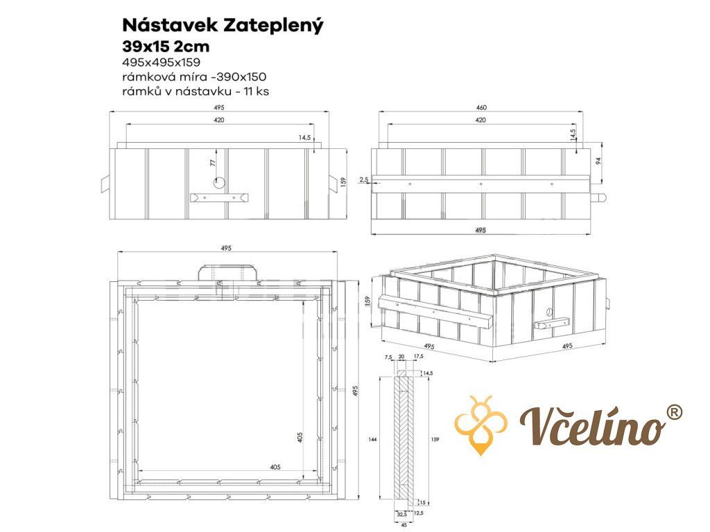 Zateplený nástavek 39x15 cm (2 cm polystyren) je tradiční a velmi rozšířený typ v ČR. Má pevnou konstrukci ze dvou čepovaných rámů, oboustranné palubky a izolační vrstvu EPS 100, která zajišťuje dobré mikroklima po celý rok. Spoje jsou lepené lepidlem D4 a sponované, což zaručuje vysokou pevnost bez deformací. Nástavek má čtvercový půdorys, je vhodný pro teplou i studenou stavbu a obsahuje očko Ø25 mm s uzávěrem.