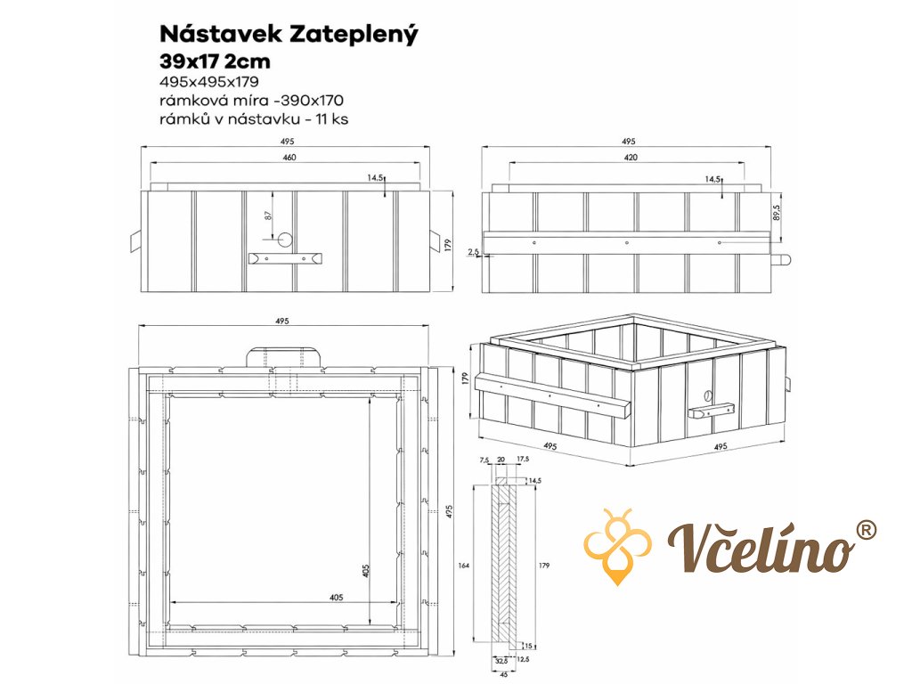 Zateplený nástavek 39×17 cm (2 cm polystyren) je tradiční a velmi rozšířený typ v ČR. Má pevnou konstrukci ze dvou čepovaných rámů, oboustranné palubky a izolační vrstvu EPS 100, která zajišťuje dobré mikroklima po celý rok. Spoje jsou lepené lepidlem D4 a sponované, což zaručuje vysokou pevnost bez deformací. Nástavek má čtvercový půdorys, je vhodný pro teplou i studenou stavbu a obsahuje očko Ø25 mm s uzávěrem.