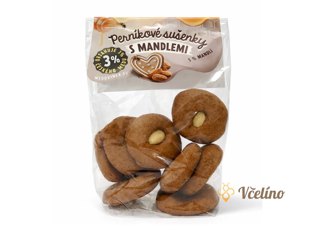 Voňavé pečivo pro všechny milovníky perníkové chuti. Perníkové sušenky s mandlemi jsou pečené z pšeničné mouky, medu z ČR, kakaa, perníkového koření a skořice, doplněné o křupavé loupané mandle.