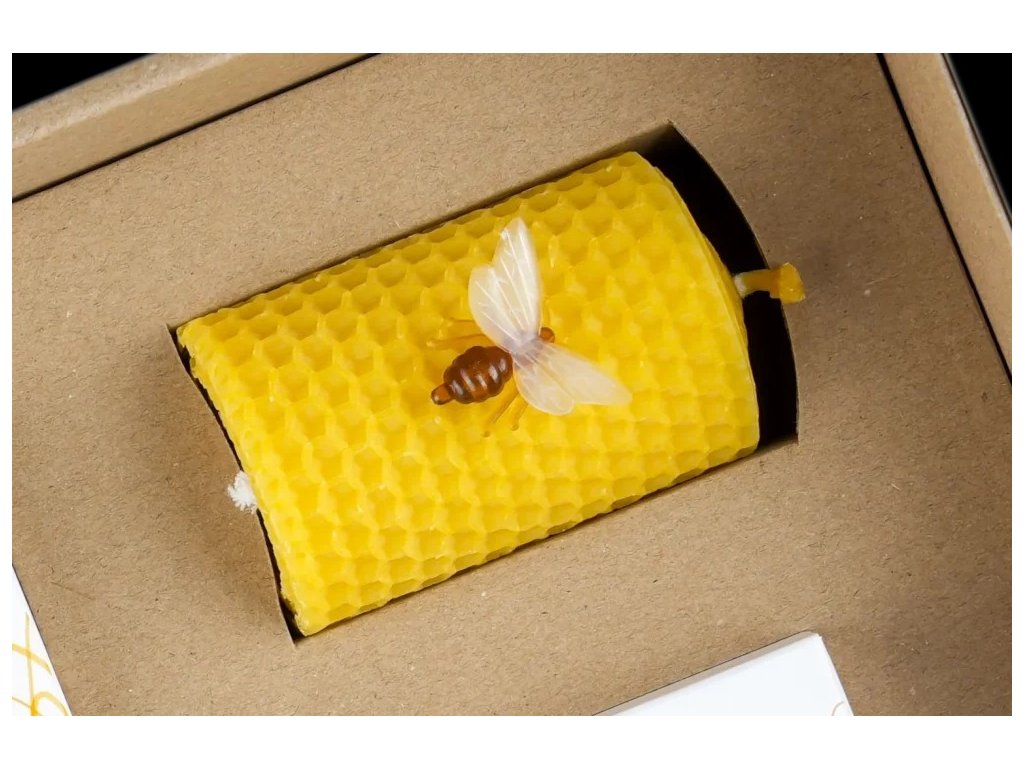 Ručně motaná svíčka z pravého včelího vosku (výška 6,7 cm, průměr 4 cm) s jemnou medovou vůní, která navodí pocit klidu a domova. Doplňuje ji roztomilá včelka na dekoračním špendlíku.