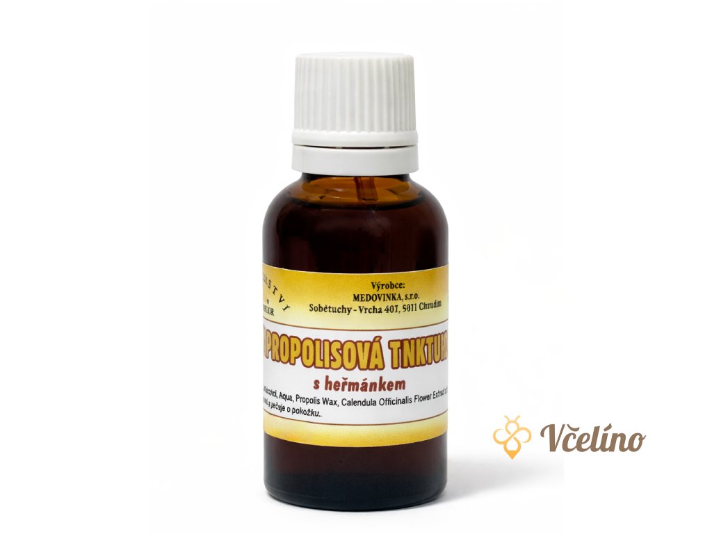 Propolisová tinktura s heřmánkem spojuje přírodní sílu včelího propolisu a zklidňující účinky heřmánku. Propolis je včelami využíván jako antibakteriální „stavební materiál“ v úlu – je bohatý na pryskyřice, éterické oleje, vosky, bioflavonoidy, vitaminy a minerály.