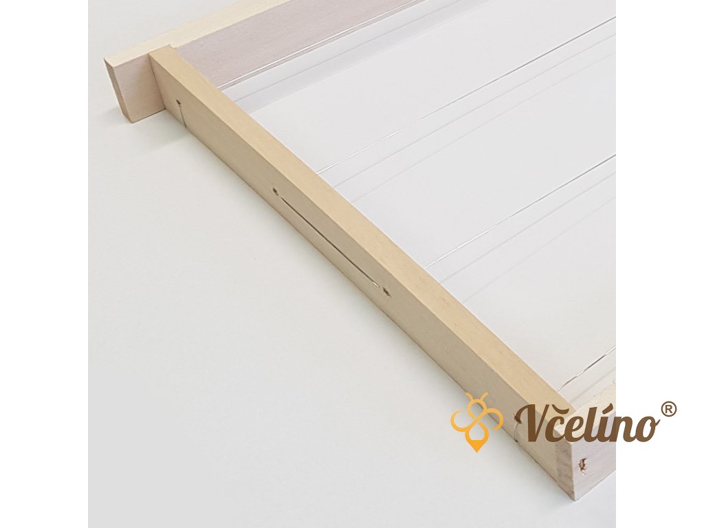 Prémiový rámek 39×24 (390×240 mm) rovný - vodorovně vypletený je připravený k okamžitému použití – z kvalitního lipového dřeva s přesným vrtáním a perfektně slícovanou konstrukcí. Pevnost zajišťuje odolný „U“ spoj boční loučky lepený vodostálým lepidlem D4 a jištěný sponou, takže rámek dlouhodobě drží geometrii i při intenzivní práci. Vodorovné předepjaté drátkování z nerezového drátu 0,4 mm přináší stabilní oporu pro mezistěnu a čisté, rychlé zatavení bez pozdějšího prověšováni. Profil typu Hoffman automaticky udržuje ideální včelí mezeru 6–8 mm a díky náběhu na boční loučce se rámky v úlu vkládají přesně bez zbytečných zdržení.