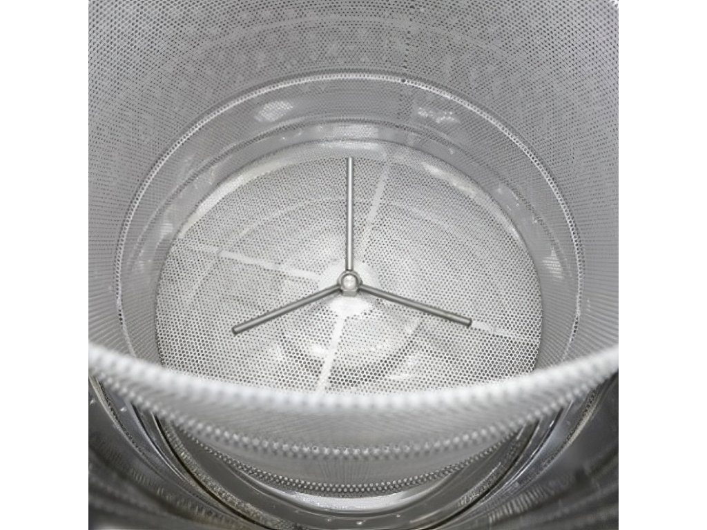 • Rotační proces: Perforovaný koš umožňuje efektivní odstředění vosku při otáčení bubnu.