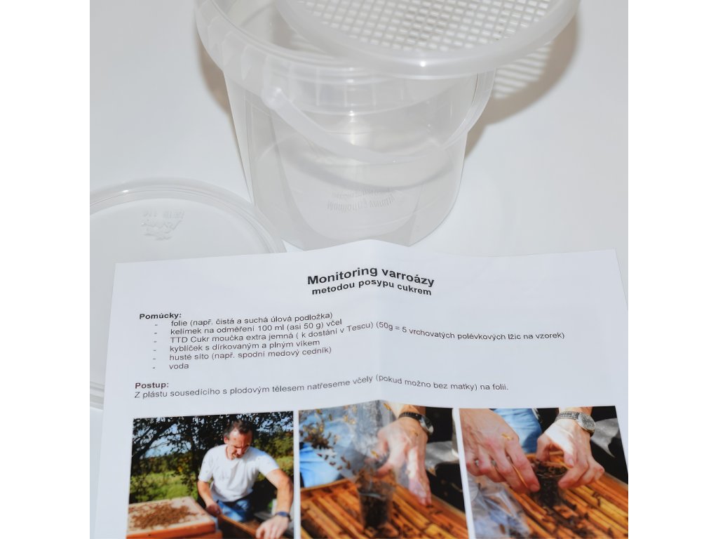 Pomůcka je založena na testování pomocí moučkového cukru – suchého, jemného a bez hrudek. Cukr roztoče uvolní z těla včel a ti následně propadnou sítem. Včely po testu bez poškození vracíte zpět do úlu.