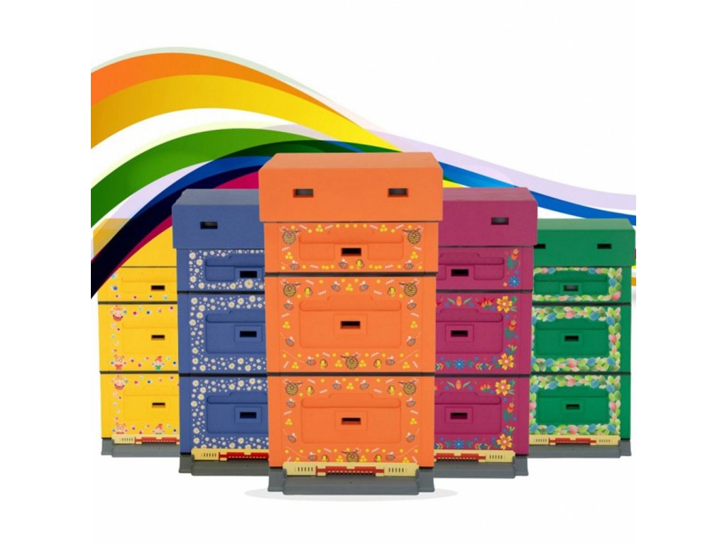 Stylový a zároveň plně funkční nástavkový úl s květinovým potiskem – spojuje krásu lidové estetiky s pohodlím moderního včelaření.