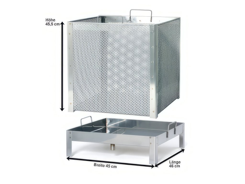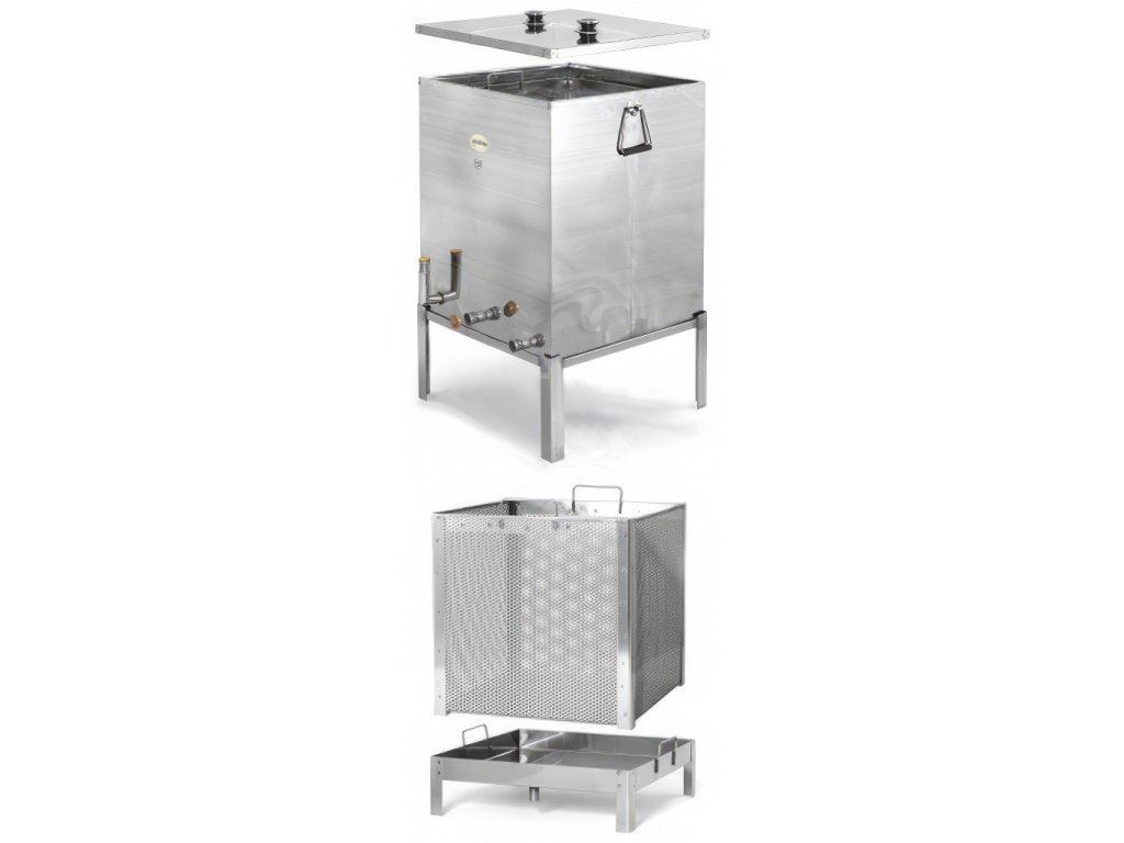 Vařák má stabilní 4nohou základnu pro maximální stabilitu, což znamená, že je bezpečný a pohodlný pro použití i při větších objemech vosku. Koš na rámky pojme až 12 rámků 39x24 nebo více menších rámků, což je ideální pro střední a větší včelařské provozy.