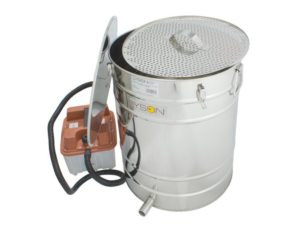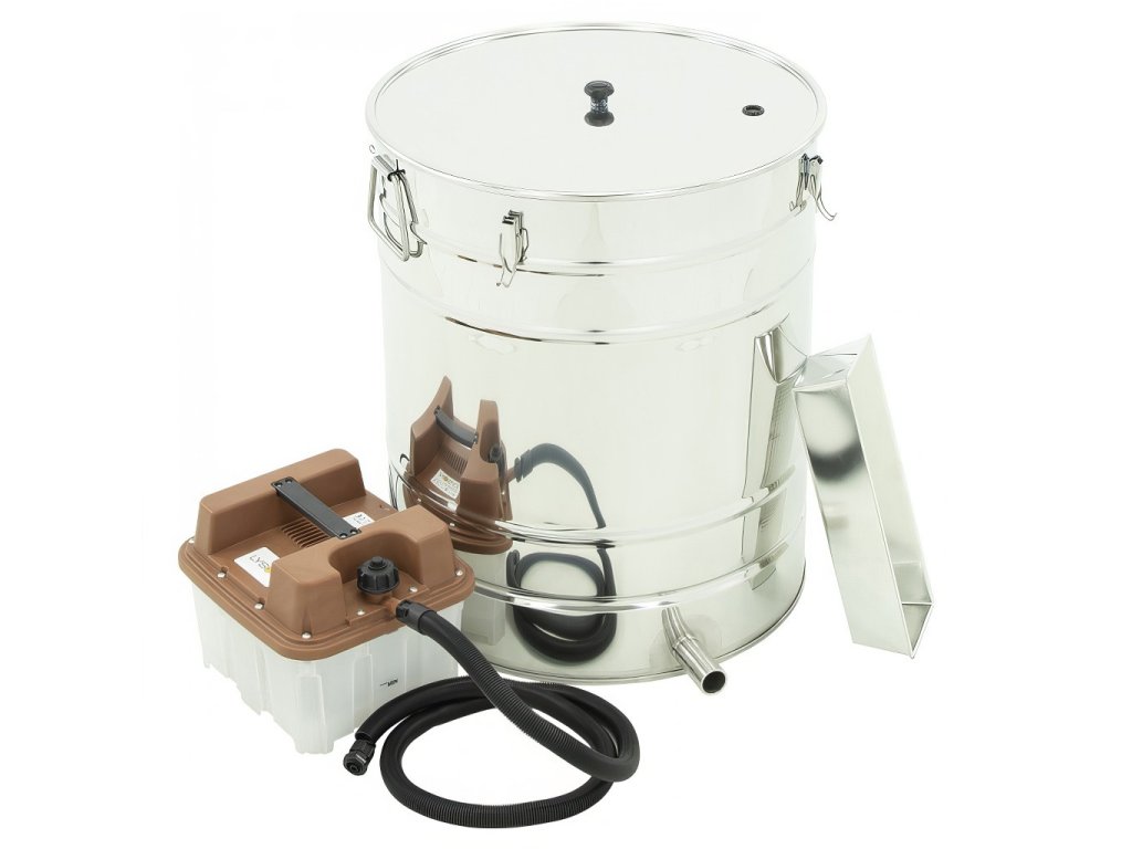 S objemem 100 litrů je tento vařák ideální pro větší včelařské provozy. Kruhové víko se klipsy umožňuje snadné uzavření nádoby a udržení páry uvnitř. Vařák má nerezovou perforovanou vložku na dně, která poskytuje stabilní a efektivní podložení pro souše.