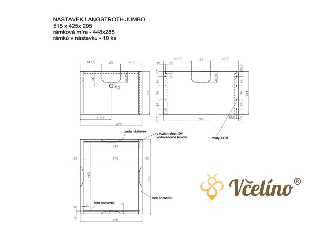 Celodřevěný nástavek Langstroth Jumbo z Borovice vejmutovky v demontovaném stavu je určen pro včelaře, kteří preferují vlastní montáž a chtějí ušetřit na pořizovací ceně i dopravě. Nástavek je vhodný jak pro plodiště, tak pro medník a je navržen pro studenou stavbu, která je pro včely přirozená a zdravá. Nefalcované provedení po obvodu umožňuje snadné skládání nástavků a minimalizuje mačkání včel.