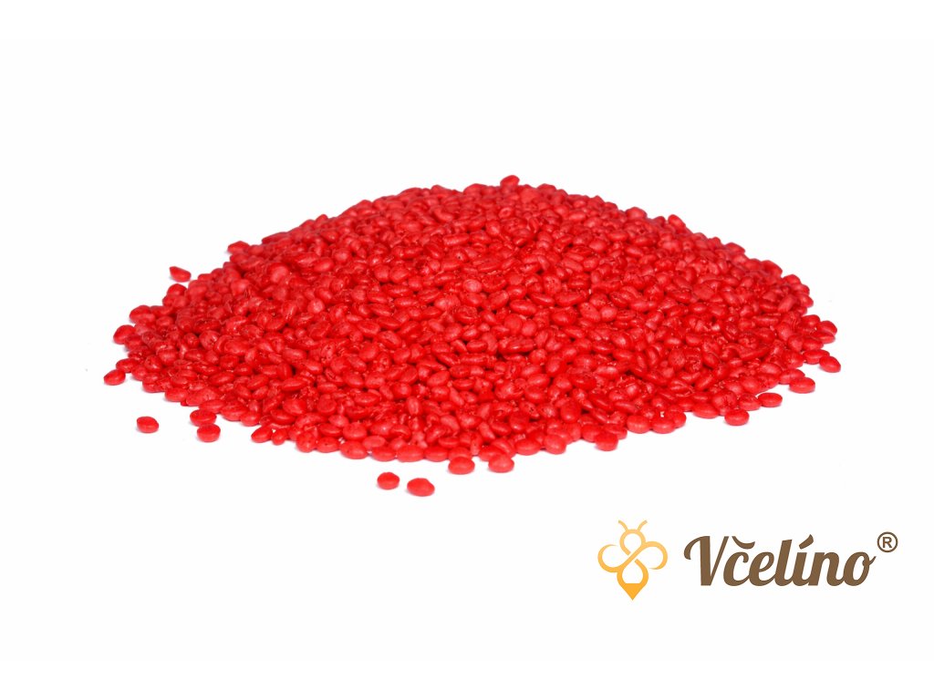 Kvalitní červené voskové pelety z přírodního včelího vosku pro výrobu svíček, dekorací a další kreativní využití.