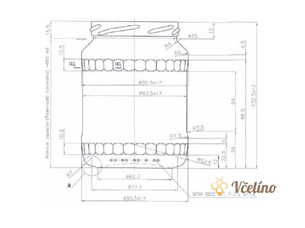 Vyrobená z odolného čirého skla, které umožňuje pohled na obsah a snadno se sterilizuje. Sklenice je uzpůsobena pro běžně dostupná víčka typu Twist TO 82, což zajišťuje snadné a bezpečné uzavření.